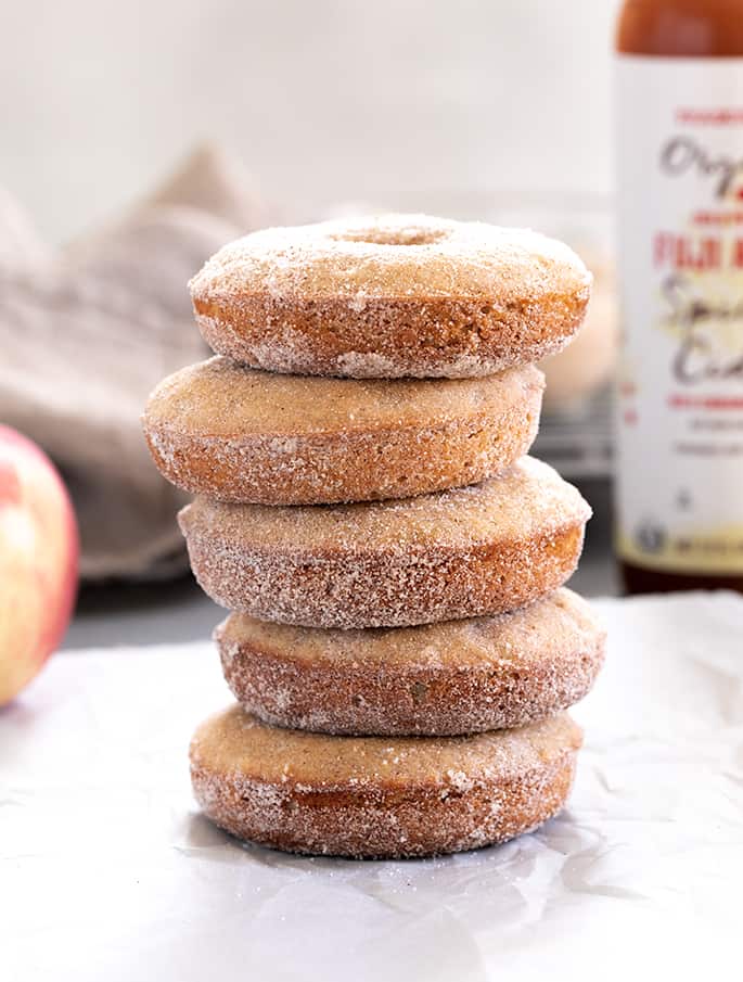 While the donuts cool slightly, place the cinnamon sugar topping ingredients into a small bowl. Gently remove the slightly cooled (but still warm) donuts from the doughnut pan with your fingertips and turn them around in the cinnamon sugar until they are well-coated on all sides. Place the finished donuts on a clean sheet of parchment paper. Serve immediately, or at least within a day or two stored uncovered at room temperature. Freeze any remaining leftovers in a sealed, freezer-safe container.