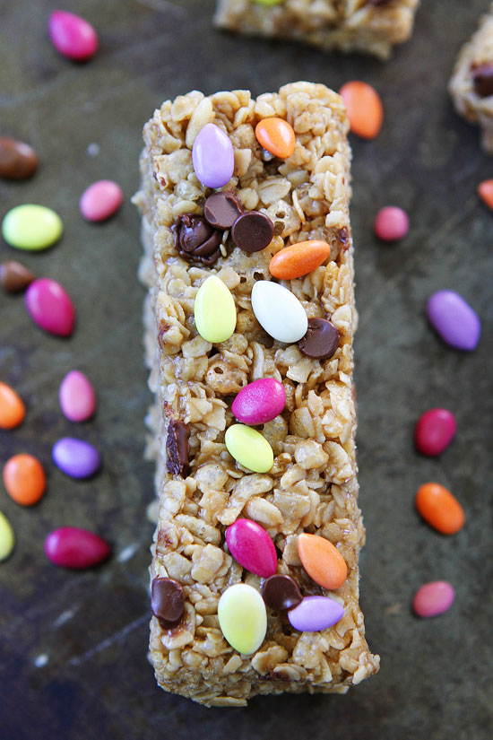 Stir in the oat and cereal mixture. Stir until well coated. Pour into the prepared pan and press the mixture evenly into the pan. Sprinkle the chocolate covered sunflower seeds and mini chocolate chips over the top and gently press into the granola bars with your hands.