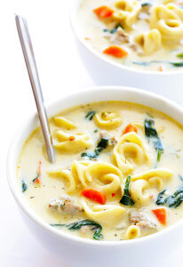 Stir in the cooked sausage, tortellini, spinach, and milk, and continue simmering for 4-5 minutes, or until the tortellini is al dente.